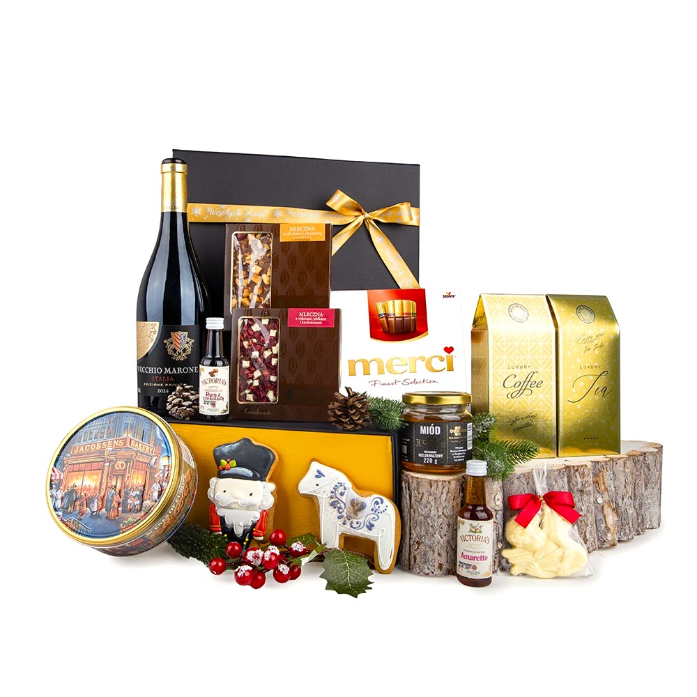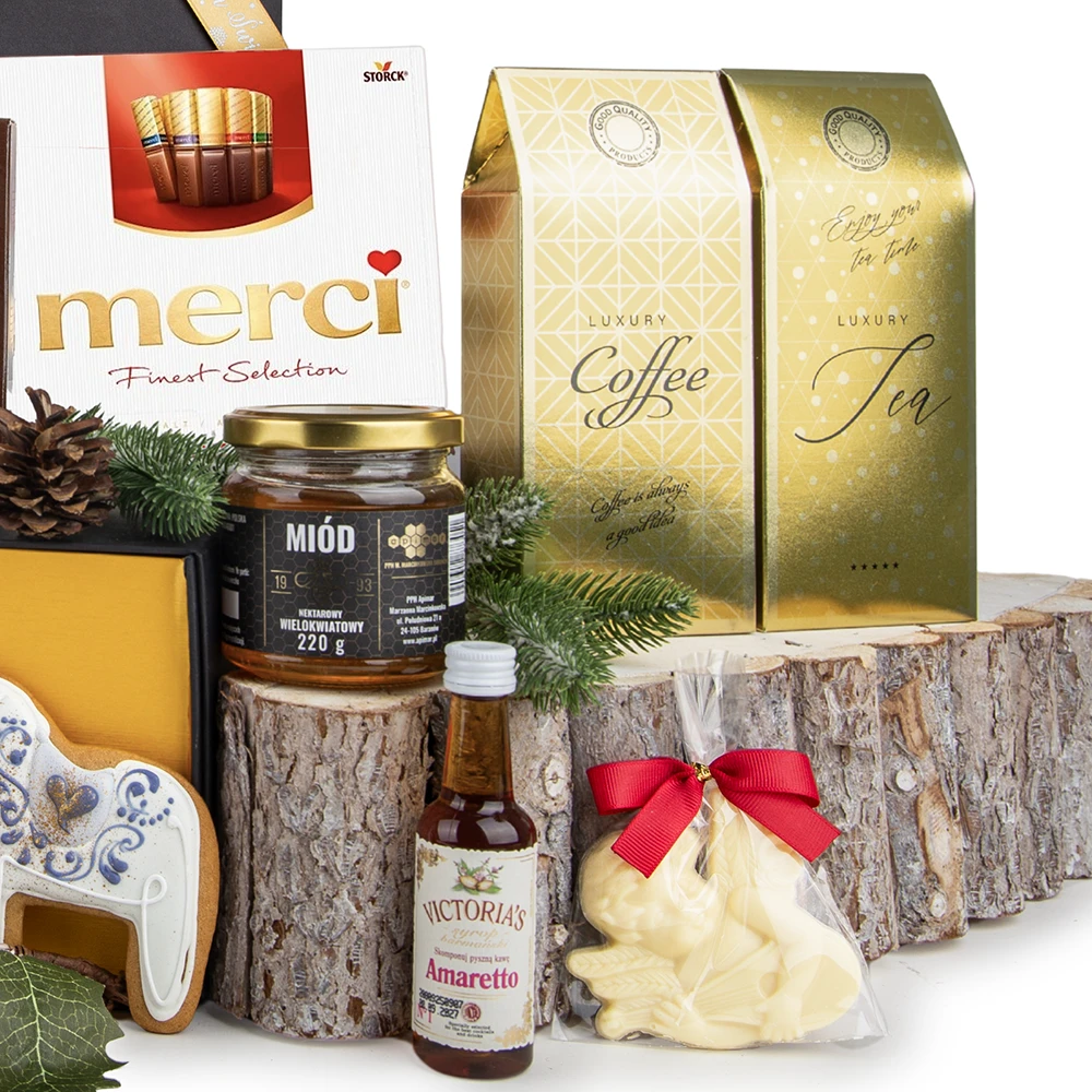 Dla miłośników aromatycznych napojów w zestawie przygotowano Kawa ziarnista palona 100g oraz Czarna japońska herbata liściasta z płatkami róży 80g, a także dwa Wyśmienite syropy do kawy i drinków 50ml, w tym wariant Amaretto do małych butelek z likierami (np. Rum z czekoladą). Świąteczny klimat dopełniają Lukrowany ręcznie dekorowany piernik w kształcie dziadka do orzechów oraz Lukrowany ręcznie dekorowany piernik w kształcie konika. Nie zapomniano również o Miodzie, w którym zanurzone są Orzechy włoskie i laskowe zatopione w miodzie 220g, stanowiące esencję miodowych świąt.