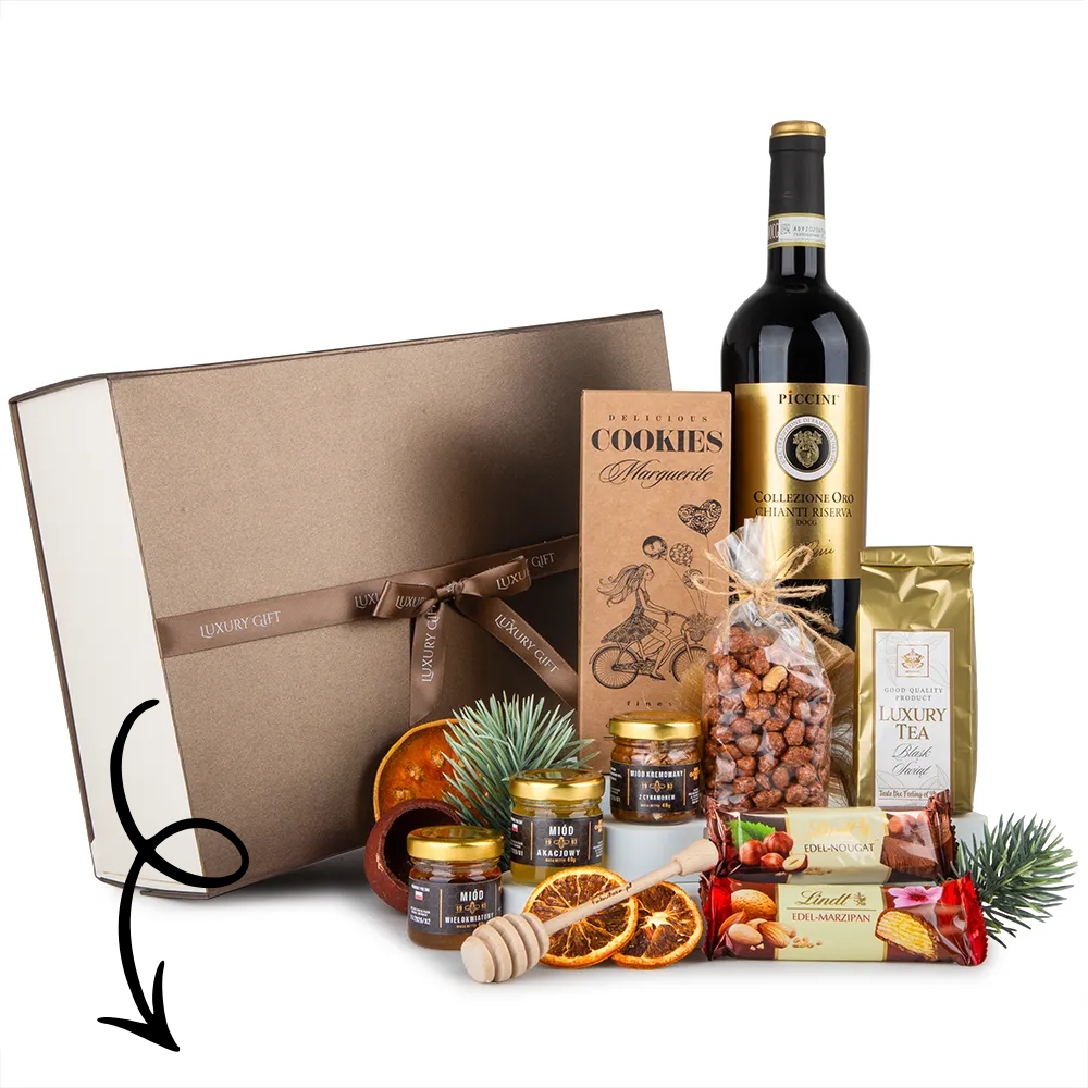 Centralnym punktem zestawu jest Piccini Collezione Oro Chianti Riserva 0,75L. To szlachetne, włoskie wino o głębokim, rubinowym kolorze i wyczuwalnych nutach wiśni i przypraw. Doskonałe do podania przy świątecznym stole i idealne na prezent dla konesera wina.